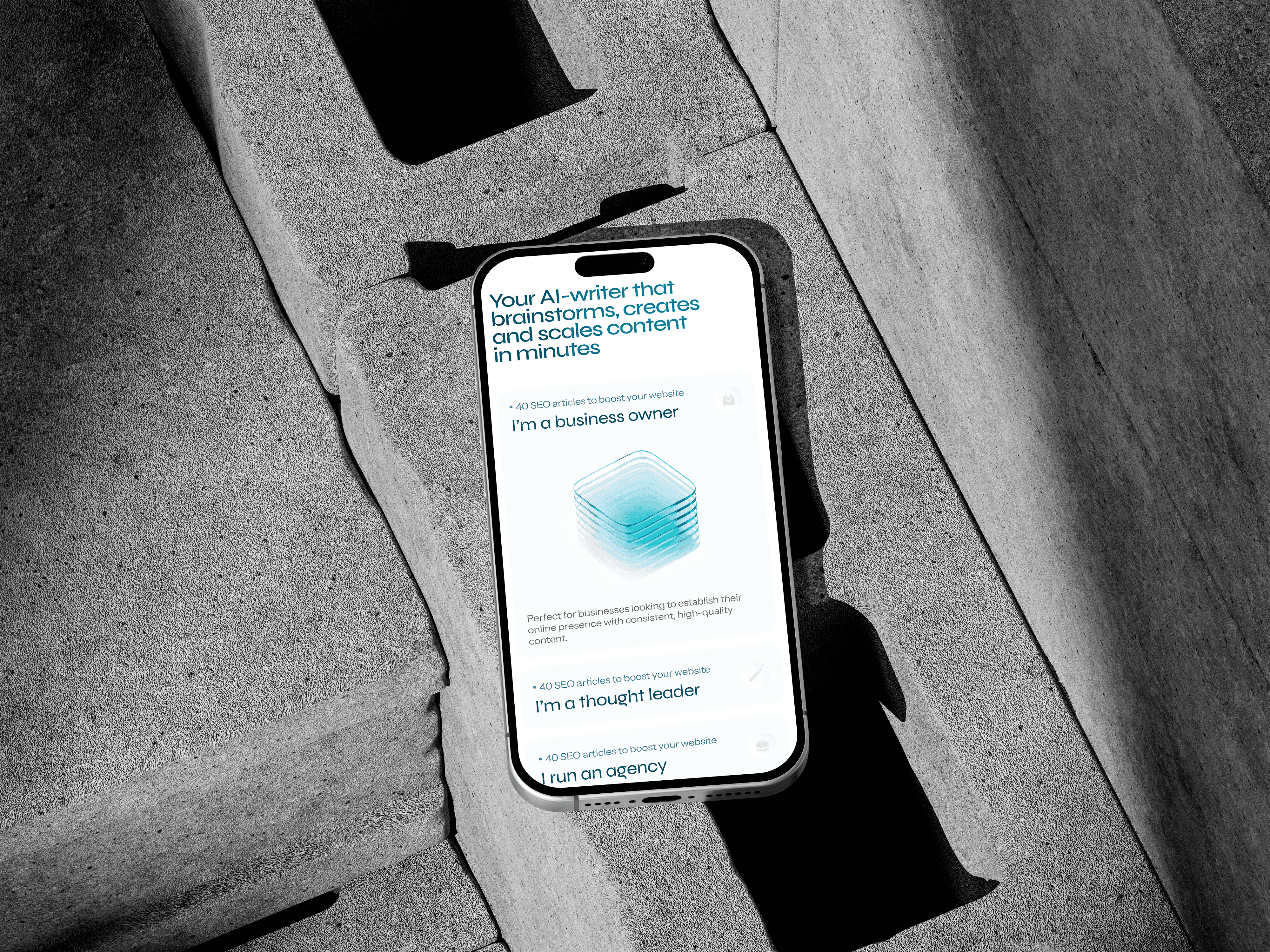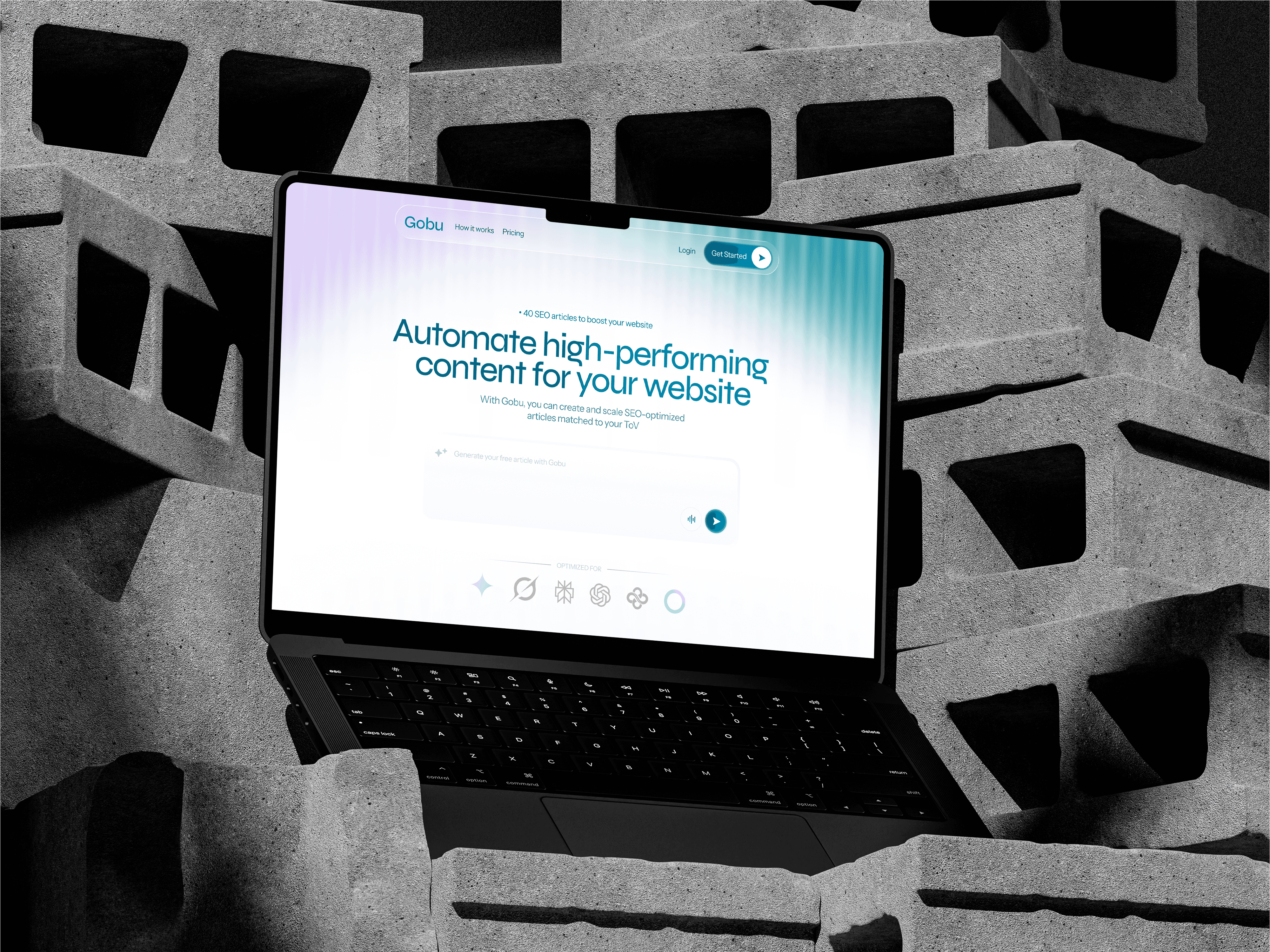 Custom 3D “glass” shapes act as metaphors for Gobu’s layered, multi-model workflow. Their stacked, folded, and morphing forms mirror how the system processes tone of voice, context, SEO layers, and semantic structure. This instantly sets Gobu apart from generic AI agent aesthetics.